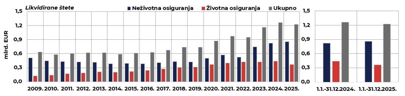 Iznos likvidiranih šteta u prva dva mjeseca 2026. iznosio je 188,8 mil. EUR, što je za 1,5 % manje u odnosu na isto prošlogodišnje razdoblje. Od tog iznosa na životno se osiguranje odnosi 52,5 mil. EUR (27,8 %), odnosno 2,1 % manje na godišnjoj razini, a na neživotno osiguranje 136,3 mil. EUR (72,2 %), što je 1,3 % manje u usporedbi s istim razdobljem prethodne godine. U ukupnom iznosu likvidiranih šteta u neživotnom osiguranju najveći se iznosi odnose na osiguranje od odgovornosti za upotrebu motornih vozila (41,9 %), osiguranje cestovnih vozila (21,8 %), zdravstveno osiguranje (12,1 %) te osiguranje od požara i elementarnih šteta (7,4 %).