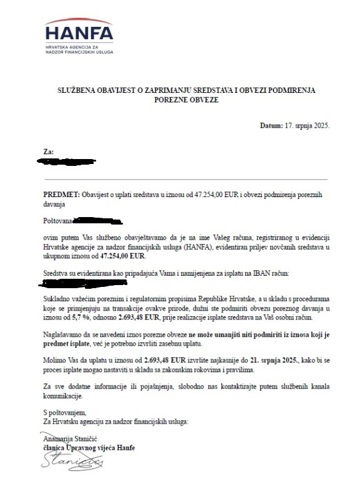 Još jednom napominjemo da Hanfa nikada ne šalje građanima dopise sa zahtjevom za uplatu radi realizacije bilo kakve investicije, porezne obaveze ili obaveze osiguranja plaćanja te je uvijek riječ o nastavku već ranije započete prijevare na koju su građani nepažnjom nasjeli.