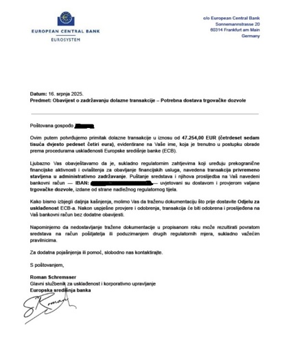 U svim se dopisima, bez obzira na lažiranog pošiljatelja, govori o potrebi dodatne uplate novca, čime će se osigurati isplata uloženog i zarađene dobiti. Navodi se da su sredstva „na čekanju“ te da je potrebno podmiriti određeni postotak od ukupnog iznosa.