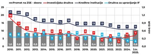 Na kraju trećeg tromjesečja 2025. godine poslovale su 22 pravne osobe ovlaštene za pružanje investicijskih usluga, odnosno 7 investicijskih društava, 11 kreditnih institucija i 4 društva za upravljanje investicijskim fondovima. Na tromjesečnoj se razini vrijednost imovine kojom upravljaju investicijska društva povećala za 17,2 %, imovina kojom upravljaju kreditne institucije veća je u odnosu na prethodno tromjesečje za 3,1 %, dok se vrijednost imovine pod upravom društava za upravljanje investicijskim fondovima povećala za 0,2 %. Ukupna imovina pod skrbništvom investicijskih društava iznosila je na kraju trećeg tromjesečja 2025. godine 1,6 mlrd. EUR, što je na tromjesečnoj razini rast od 15,2 %, dok je imovina pod skrbništvom kreditnih institucija veća u odnosu na prethodno tromjesečje za 3,3 % i iznosi 29,3 mlrd. EUR.