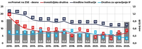 Na kraju četvrtog tromjesečja 2025. godine poslovale su 22 pravne osobe ovlaštene za pružanje investicijskih usluga, odnosno 7 investicijskih društava, 11 kreditnih institucija i 4 društva za upravljanje investicijskim fondovima. Na tromjesečnoj se razini vrijednost imovine kojom upravljaju investicijska društva povećala za 18,5 %, imovina kojom upravljaju kreditne institucije bila je veća u odnosu na prethodno tromjesečje za 7,3 %, dok se vrijednost imovine pod upravljanjem društava za upravljanje investicijskim fondovima smanjila za 0,03 %. Ukupna imovina pod skrbništvom investicijskih društava iznosila je na kraju četvrtog tromjesečja 2025. godine 1,7 mlrd. EUR, što je na tromjesečnoj razini rast od 5,5 %, dok je imovina pod skrbništvom kreditnih institucija bila veća u odnosu na prethodno tromjesečje za 3,4 % te je iznosila 30,3 mlrd. EUR.