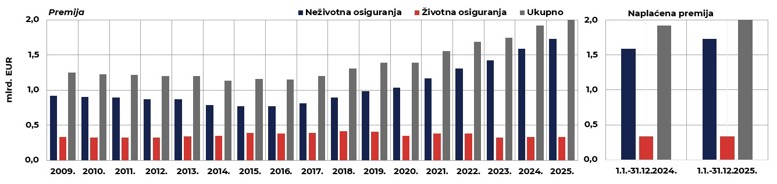 U veljači 2026. poslovalo je ukupno 14 društava za osiguranje. Ukupna naplaćena premija u prva dva mjeseca 2026. iznosila je 327,6 mil. EUR, odnosno 4,9 % više nego u istom razdoblju prethodne godine. Od toga se 49,7 mil. EUR (15,2 %) odnosi na premiju životnih osiguranja, što je 3,1 % više nego u istom razdoblju prethodne godine, a 277,9 mil. EUR ili 84,8 % na premiju neživotnih osiguranja, što je na godišnjoj razini 5,3 % više. U strukturi naplaćene premije neživotnih osiguranja najzastupljenije je osiguranje od odgovornosti za upotrebu motornih vozila (34,4 %), zatim osiguranje cestovnih vozila (20,4 %), osiguranje od požara i elementarnih šteta (9,6 %) te zdravstveno osiguranje (9,5 %).