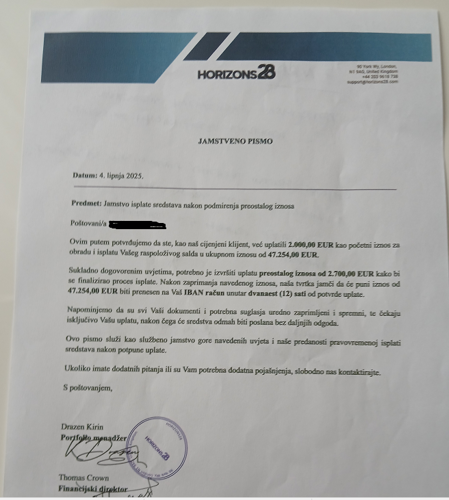 Hrvatska agencija za nadzor financijskih usluga (Hanfa) skreće pozornost javnosti na investicijsku prijevaru u kojoj se u komunikaciji s građanima koriste lažni dopisi Hanfe, Europske središnje banke i FINRA-e, koja oponaša logotip i naziv hrvatske FINA-e. U posljednje vrijeme takav je slučaj zabilježen od strane internetske platforme Horizons 28.