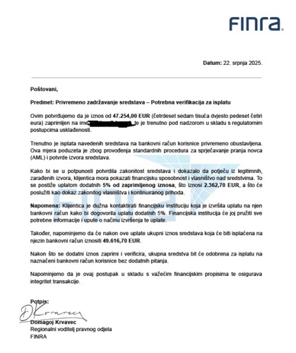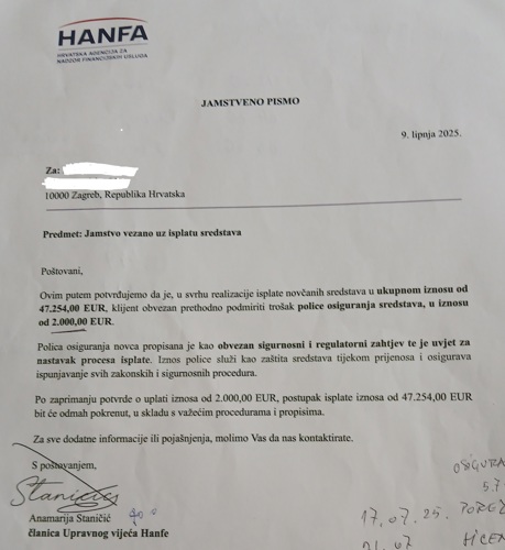 Još jednom napominjemo da Hanfa nikada ne šalje građanima dopise sa zahtjevom za uplatu radi realizacije bilo kakve investicije, porezne obaveze ili obaveze osiguranja plaćanja te je uvijek riječ o nastavku već ranije započete prijevare na koju su građani nepažnjom nasjeli.
