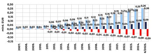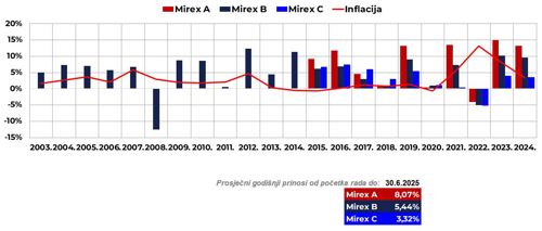 Neto imovina OMF-ova na kraju lipnja 2025. iznosila je 24,6 mlrd. EUR, što je za 315,6 mil. EUR (1,3 %) više nego u prethodnom mjesecu, dok je u odnosu na početak godine ona veća za 1,4 mlrd. EUR, odnosno 6,1 %. Na kraju lipnja nominalni mjesečni prinosi Mirexa iznosili su 1,80 % za kategoriju A, 0,94 % za kategoriju B i 0,03 % za kategoriju C, a prinosi od početka godine iznosili su 7,2 % za Mirex A, 3,6 % za Mirex B i 1,2 % za Mirex C. Na godišnjoj su razini prinosi Mirexa iznosili 14,00 % za kategoriju A, 8,68 % za kategoriju B i 3,75 % za kategoriju C, a anualizirani[1] prinosi od početka rada OMF-ova iznosili su 8,07 % za Mirex A, 5,44 % za Mirex B i 3,32 % za Mirex C[2].
