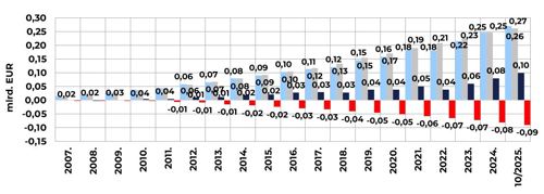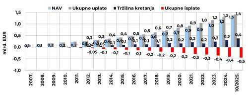 Na kraju listopada 2025. broj članova 8 otvorenih dobrovoljnih mirovinskih fondova (ODMF) povećao se za 0,5 % na mjesečnoj razini, a broj članova 21 zatvorenog dobrovoljnog mirovinskog fonda (ZDMF) za 0,1 % te su spomenuti fondovi imali 437.491 (ODMF) odnosno 50.419 članova (ZDMF). Ukupne uplate u dobrovoljne mirovinske fondove (DMF) u listopadu 2025. iznosile su 12,0 mil. EUR (0,8 % neto imovine s kraja prethodnog mjeseca), što je za 3,4 % više u odnosu na prethodni mjesec. Ukupne isplate iz DMF-ova u listopadu 2025. iznosile su 5,8 mil. EUR, što je na mjesečnoj razini više za 12,5 %. Isplate zbog umirovljenja i ostalih razloga činile su 65,6 %, isplate zbog promjene fonda 24,4 %, a isplate zbog smrti 9,9 % ukupnih isplata u listopadu. Kod ukupnih isplata zbog umirovljenja 1,7 mil. EUR isplaćeno je putem društva (fonda), 1,0 mil. EUR u obliku jednokratnih isplata, a 1,0 mil. EUR transferirano je u mirovinska osiguravajuća društva (MOD-ove). Neto imovina DMF-ova u listopadu povećala se za 20,30 mil. EUR (1,3 % na mjesečnoj razini) te je iznosila 1,6 mlrd. EUR. Mjesečni nominalni prinosi DMF-ova u listopadu su se kretali između 0,3 % i 1,7 %, a prinosi na godišnjoj razini od 2,5 % do 16,2 %. Kod strukture ulaganja DMF-ova najveći dio portfelja čine obveznice (53,2 % imovine), a zatim dionice (27,8 %) te investicijski fondovi (10,6 %). Udio obveznica u ulaganjima DMF-ova povećao se na mjesečnoj razini za 0,1 p.b., a smanjio se udio dionica (za 0,3 p.b.) i udio ulaganja u investicijske fondove (za 0,1 p.b.).