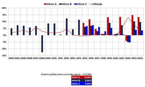 Neto imovina OMF-ova na kraju listopada 2025. iznosila je 26,1 mlrd. EUR, što je za 307,8 mil. EUR (1,2 %) više nego u prethodnom mjesecu. Na kraju listopada nominalni mjesečni prinosi Mirexa iznosili su 1,23 % za kategoriju A, 0,85 % za kategoriju B i 0,33 % za kategoriju C. Na godišnjoj su razini prinosi Mirexa iznosili 16,75 % za kategoriju A, 10,08 % za kategoriju B i 2,81 % za kategoriju C, a anualizirani[1] prinosi od početka rada OMF-ova iznosili su 8,46 % za Mirex A, 5,56 % za Mirex B i 3,30 % za Mirex C[2]. Obveznička ulaganja OMF-ova na kraju listopada 2025. iznosila su 14,7 mlrd. EUR (56,5 % imovine) te se njihov udio povećao za 0,37 p.b. na mjesečnoj razini. Zastupljenost ulaganja u dionice u imovini OMF-ova smanjila se za 0,2 p.b. na mjesečnoj razini te su ona na kraju listopada iznosila 24,3 % imovine OMF-ova (6,3 mlrd. EUR). Pritom su ulaganja u domaće dionice činila 14,2 %, a ulaganja u strane dionice 10,1 % imovine OMF-ova. Ulaganja u investicijske fondove iznosila su 2,7 mlrd. EUR (10,4 % imovine) te se njihov udio u ukupnoj imovini povećao za 0,2 p.b. u odnosu na prethodni mjesec. Novac i depoziti činili su u listopadu 6,2 % imovine, odnosno 1,6 mlrd. EUR, što na mjesečnoj razini predstavlja pad od 0,3 p.b.