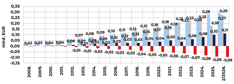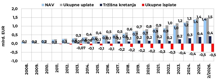 Na kraju veljače 2026. broj članova 8 otvorenih dobrovoljnih mirovinskih fondova (ODMF) povećao se za 0,67 % na mjesečnoj razini, a broj članova 21 zatvorenog dobrovoljnog mirovinskog fonda (ZDMF) za 0,36 % te su spomenuti fondovi imali 449.707 (ODMF), odnosno 51.263 člana (ZDMF). Ukupne uplate u dobrovoljne mirovinske fondove (DMF) u veljači 2026. iznosile su 14,1 mil. EUR (0,8 % neto imovine s kraja prethodnog mjeseca), što je za 6,9 % manje u odnosu na prethodni mjesec. Ukupne isplate iz DMF-ova iznosile su 8,1 mil. EUR, što je na mjesečnoj razini 3,5 % više. Isplate zbog umirovljenja i ostalih razloga činile su 62,7 %, isplate zbog promjene fonda 34,2 %, a isplate zbog smrti 3,1 % ukupnih isplata u veljači. Kod ukupnih isplata zbog umirovljenja 2,0 mil. EUR isplaćeno je putem društva (fonda), 1,8 mil. EUR u obliku jednokratnih isplata, a 1,3 mil. EUR transferirano je u mirovinska osiguravajuća društva (MOD-ove).