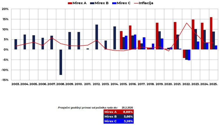 Neto imovina OMF-ova na kraju veljače 2026. iznosila je 27,6 mlrd. EUR, što je za 549,5 mil. EUR (2,0 %) više nego u prethodnom mjesecu. Na kraju veljače nominalni mjesečni prinosi Mirexa iznosili su 2,75 % za kategoriju A[1],1,69 % za kategoriju B i 0,48 % za kategoriju C. Na godišnjoj su razini prinosi Mirexa iznosili 18,38 % za kategoriju A, 9,94 % za kategoriju B i 2,23 % za kategoriju C, a anualizirani[2] prinosi od početka rada OMF-ova iznosili su 8,88 % za Mirex A, 5,66 % za Mirex B i 3,26 % za Mirex C[3].