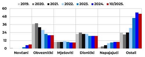 Neto imovina novčanih fondova na kraju listopada činila je 33,3 % ukupne neto imovine svih UCITS fondova, 20,1 %obvezničkih fondova, 18,5 %fondova iz kategorije „ostali“, dok su dionički i mješoviti fondovi činili 18,4 % odnosno 7,3 % ukupne neto imovine UCITS fondova. Pozitivan mjesečni prinos ponderiran imovinom u listopadu su imale sve vrste fondova, i to dionički fondovi (3,5 %), napajajući fondovi (2,5 %), mješoviti fondovi (1,6 %), obveznički fondovi (0,5 %), fondovi iz kategorije „ostali“ (0,4 %) i novčani fondovi (0,2 %).