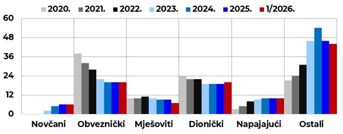 Na kraju siječnja 2026. poslovalo je ukupno 107 UCITS fondova. Njihova ukupna neto imovina iznosila je 4,1 mlrd. EUR te je bila za 90,4 mil. EUR ili 2,2 % veća u odnosu na prethodni mjesec. Ukupne mjesečne neto uplate u sve UCITS fondove u siječnju su bile pozitivne i iznosile su 43,7 mil. EUR. Pozitivne neto uplate imali su dionički fondovi (34,4 mil. EUR), novčani fondovi (10,3 mil. EUR) i fondovi iz kategorije „ostali“ (1,8 mil. EUR), dok su negativne neto uplate imali napajajući fondovi (-0,3 mil. EUR), obveznički fondovi (-0,6 mil. EUR) i mješoviti fondovi (-1,8 mil. EUR).