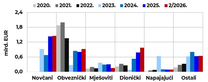 Na kraju veljače 2026. poslovalo je ukupno 108 UCITS fondova. Njihova ukupna neto imovina iznosila je 4,2 mlrd. EUR te je bila za 101,7 mil. EUR ili 2,5 % veća u odnosu na prethodni mjesec. Ukupne mjesečne neto uplate u sve UCITS fondove u veljači su bile pozitivne i iznosile su 69,3 mil. EUR. Pozitivne neto uplate imali su: dionički fondovi (34,1 mil. EUR), fondovi iz kategorije „ostali“ (13,6 mil. EUR), obveznički fondovi (12,0 mil. EUR), novčani fondovi (10,0 mil. EUR) i mješoviti fondovi (0,2 mil. EUR), dok su negativne neto uplate imali samo napajajući fondovi (-0,6 mil. EUR).