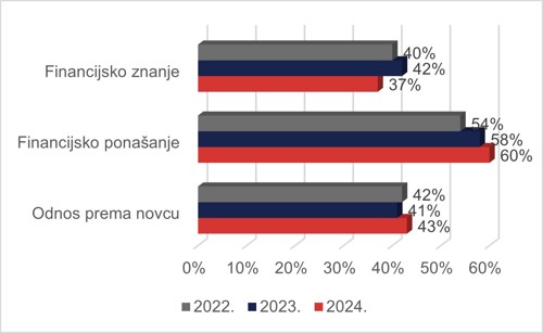 Kod učenika srednjih škola financijsko ponašanje ocijenjeno je kao najjača komponenta financijske pismenosti, dok je primijećena razlika između samoprocijenjenog znanja i stvarnog razumijevanja financijskih pojmova. Primjerice, samo 20 % učenika točno je izračunalo realnu kamatnu stopu, dok je tek 22 % učenika svjesno da uplata u treći mirovinski stup nije obvezna. Zanimljivo je i da 58 % učenika smatra da novac primarno služi za trošenje, što ukazuje na potrebu za dodatnim edukacijama o odgovornom upravljanju osobnim financijama.