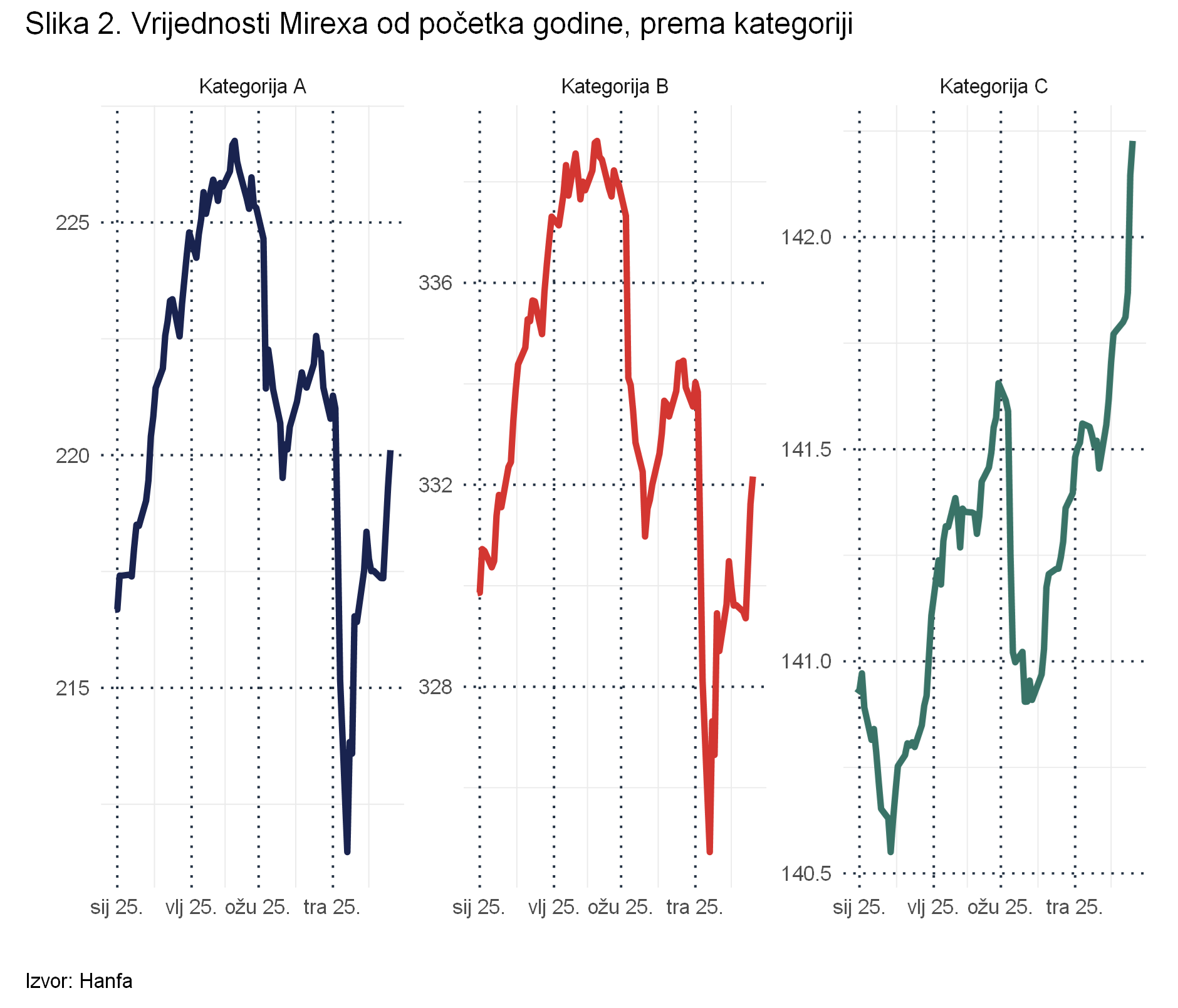 Povijest nam pokazuje da su financijska tržišta podložna krizama, pa tako i tržišta na koja ulažu mirovinski fondovi. Povijesna kretanja nam isto tako pokazuju da nakon kriza slijedi relativno brz oporavak. Primjerice, prema procjenama NBER-a[1] prosječna kontrakcija tržišta traje oko 12 mjeseci, pri čemu izraženije kontrakcije, kao npr. globalna financijska kriza 2008., mogu trajati i do 18 mjeseci. No vrijednosti udjela u mirovinskim fondovima čak su se i tijekom takvih kriznih epizoda oporavile u razmjerno kratkom roku, a upravo tome smo svjedočili i u recentnoj epizodi s početka travnja 2025. godine (slika 2.). Jedan je od razloga za to metoda prosječnog troška (engl. cost-averaging), koja se zasniva na redovitim uplatama sredstava, primjerice na mjesečnoj frekvenciji. Takav pristup smanjuje rizik ulaganja svih sredstava u nepovoljnom trenutku, odnosno na tržišnom vrhuncu, a istovremeno omogućuje kupnju većeg broja udjela tijekom kriznih razdoblja, odnosno kada su cijene imovine niže. Dugoročno ova metoda ulaganja „uprosječuje“ cijenu ulaganja i ublažava utjecaj tržišnih oscilacija, čime dodatno doprinosi stabilnosti imovine članova mirovinskih fondova. Važno je naglasiti da mirovinski fondovi nisu dizajnirani za dnevne promjene, već za višegodišnje razdoblje. Mirovinski fondovi ne prate dnevna kretanja tržišta, već su usmjereni na ciljeve koji se ostvaruju kroz desetljeća. U takvom okviru strpljenje postaje ne samo vrlina, nego i konkretna prednost za svakog štedišu.