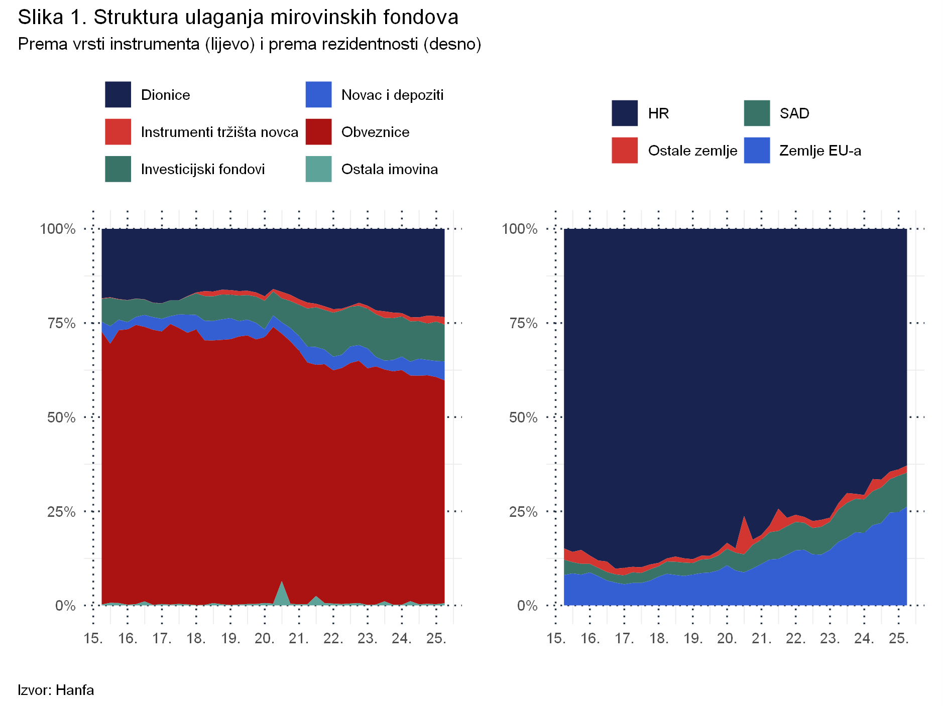 Jedno je od osnovnih pravila ulaganja diversifikacija, odnosno raspodjela sredstava na više vrsta ulaganja kako bi se smanjio rizik. Mirovinski fondovi ne ulažu sav novac u jedan oblik imovine, već ga raspoređuju između dionica, državnih i korporativnih obveznica, investicijskih fondova, pa čak i alternativnih ulaganja (slika 1.). Osim po vrstama imovine, ulaganja su i geografski raspršena – od Hrvatske i Europske unije do drugih tržišta u svijetu. Ova strategija omogućava fondovima da ublaže utjecaj negativnih događaja na jednom tržištu jer istovremeno ostvaruju prinose na drugim ulaganjima. Diversifikacija je prva linija obrane stabilnosti fonda i jedan od razloga zbog kojeg su oni otporniji na tržišne šokove.