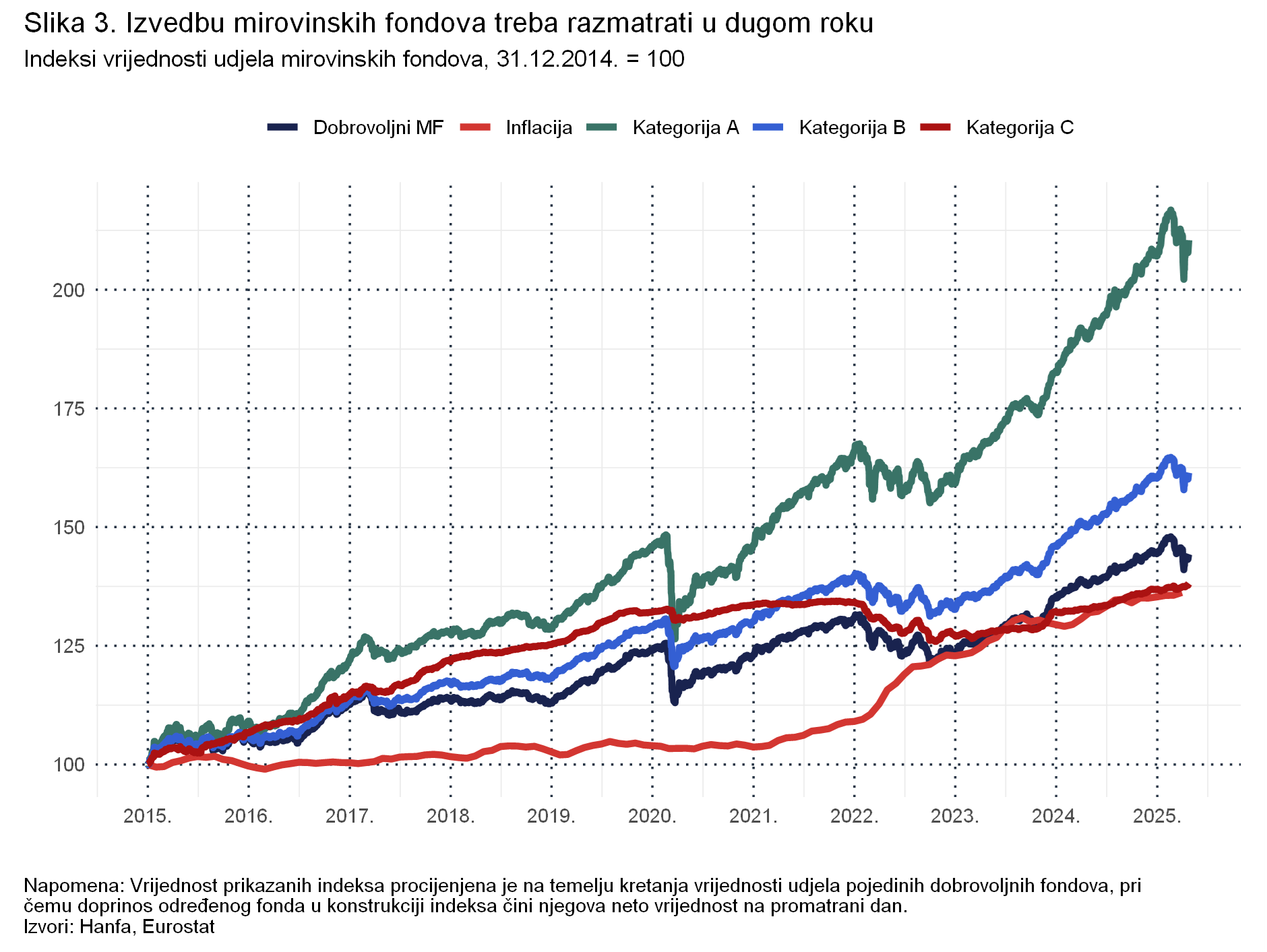 Jedan od glavnih ciljeva mirovinskih fondova nije samo ostvarivanje prinosa, već i očuvanje realne vrijednosti imovine, odnosno pobjeđivanje inflacije kroz vrijeme. U tom kontekstu svi fondovi u Hrvatskoj, neovisno o kategoriji, u posljednjih deset godina ispunili su svoju temeljnu svrhu (slika 3.). Fondovi kategorije A, namijenjeni članovima s većom sklonosti riziku, više su nego udvostručili vrijednost ulaganja. Kategorija B, u kojoj se nalazi većina članova, bilježi porast vrijednosti veći od 60 %. Čak i najkonzervativnija kategorija C, koja ulaže uz minimalni rizik, uspjela je očuvati realnu vrijednost ulaganja.