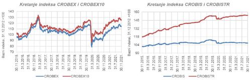 Ukupni promet na Zagrebačkoj burzi u cijeloj 2021. godini iznosio je 2,54 mlrd. HRK, što je za 18,8 % manje nego u 2020. godini. Istovremeno je tržišna kapitalizacija neznatno porasla (za 1,13 %) u odnosu na 2020. godinu. Kod dioničkih indeksa najveći godišnji rast (od 24,13 %) ostvario je CROBEXnutris, dok je najveći godišnji pad (od 31,49 %) zabilježio CROBEXkonstrukt. Dionica kojom se najviše trgovalo u 2021. bila je dionica Podravka d.d., kojom je ostvaren promet od 215,68 mil. HRK (12,4 % ukupnog trgovanja na burzi u 2021. godini) i čija je cijena ostvarila rast od 30,31 % u odnosu na kraj 2020. godine.